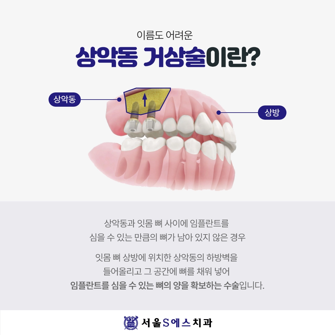 셋째, 선천적으로 뼈가 얇거나 좁은 경우입니다. 특히 상악 어금니 부위는 구조적으로 부비동(상악동)이라는 공간 때문에 뼈 높이가 부족한 경우가 많아, ‘상악동 거상술’과 함께 뼈이식을 진행해야 안전합니다.